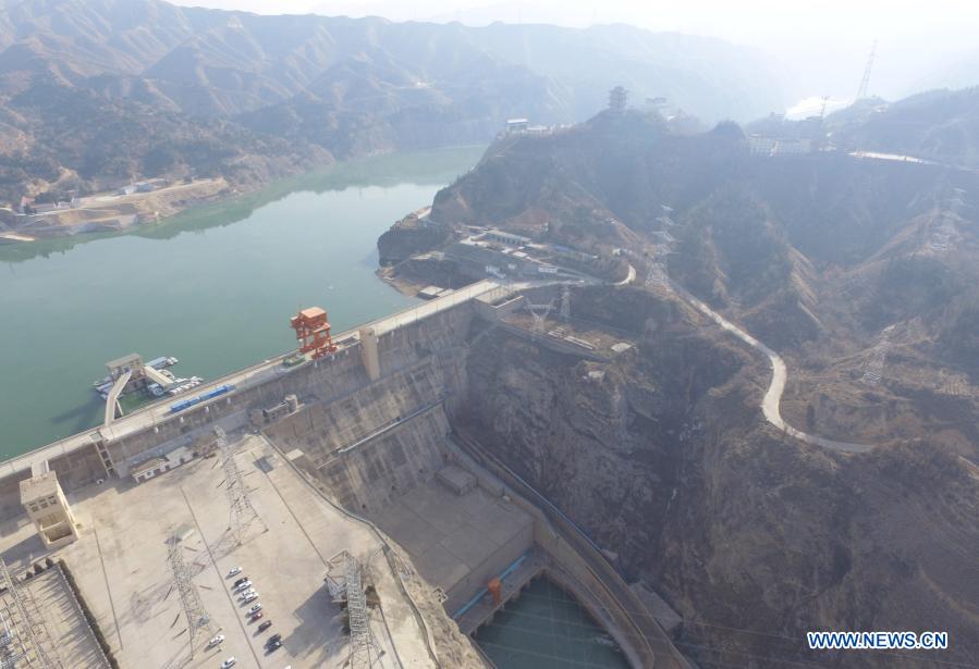 Arieal photo taken on Jan. 3, 2021 shows a view of the Liujiaxia reservoir in Yongjing County, Linxia Hui Autonomous Prefecture, northwest China's Gansu Province. In readiness for potential ice jam floods, Liujiaxia reservoir, a major reservoir on the upper reaches of Yellow River, recently cut its water outflow as required by flood control authorities. (Photo by Shi Youdong/Xinhua)