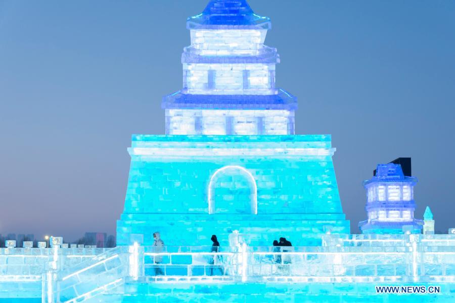 Tourists have fun at the Harbin Ice-Snow World in Harbin, northeast China's Heilongjiang Province, Jan. 1, 2021. Harbin, dubbed China's "ice city", attracts tourists by making the best use of ice element during the winter time. (Xinhua/Xie Jianfei)