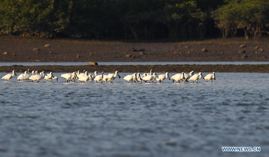 A flock of black-faced spoonbills are seen at a wetland park in Guangcun Town, Danzhou City, south China's Hainan Province, Dec. 28, 2020. Many black-faced spoonbills come to Danzhou for the warm weather there in the winter. (Xinhua/Yang Guanyu)