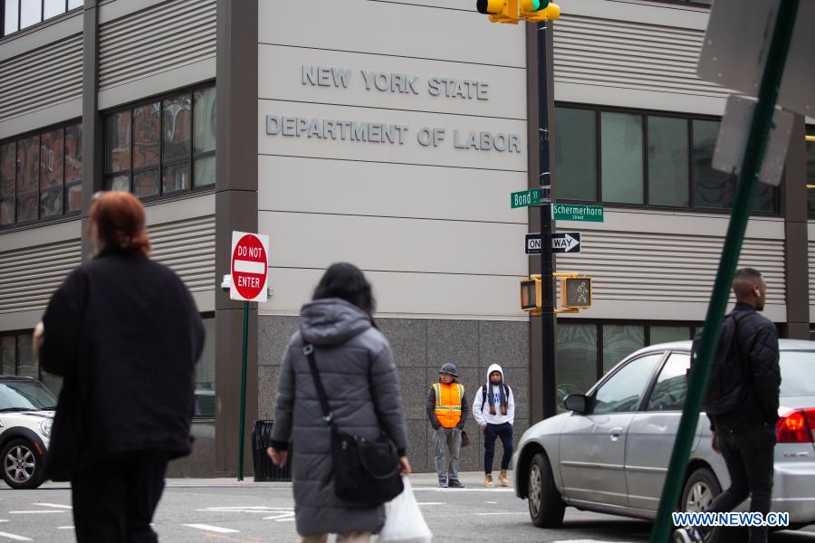 Pedestrians pass in front of the New York State Department of Labor building, in New York, United States, Jan. 8, 2021. U.S. employers slashed 140,000 jobs in December, the first monthly decline since April 2020, as the recent COVID-19 spikes disrupted labor market recovery, the Labor Department reported Friday. The unemployment rate, which has been trending down over the past seven months, remained unchanged at 6.7 percent, according to the monthly employment report. (Photo by Michael Nagle/Xinhua)