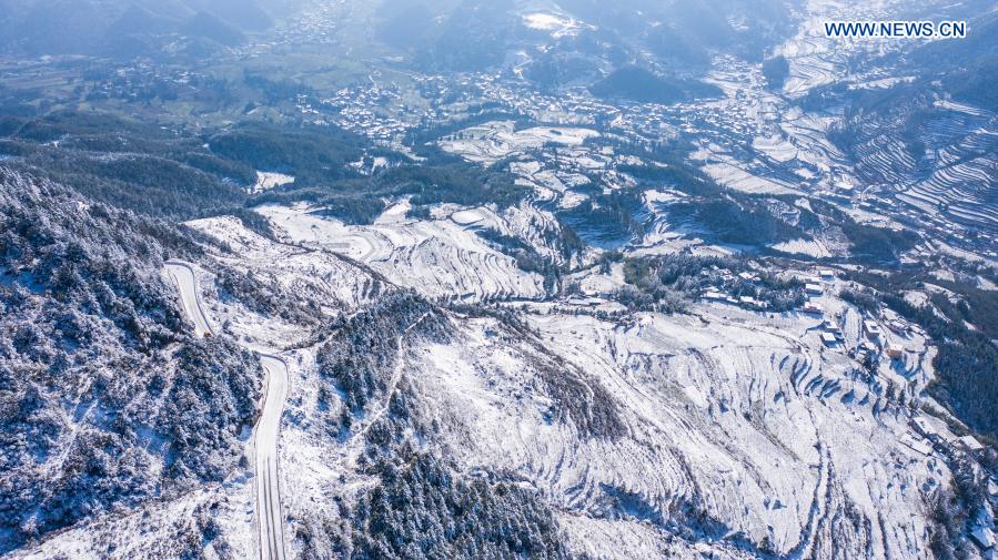 Aerial photo taken on Jan. 12, 2021 shows the snow scene in Pingdi of Panzhou in Liupanshui City, southwest China's Guizhou Province. (Xinhua/Tao Liang)