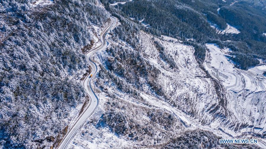 Aerial photo taken on Jan. 12, 2021 shows staff members of local power supply bureau patrolling in Liupanshui, southwest China's Guizhou Province. Liupanshui City has seen continuous snowfall in recent days. Local power supply bureau carried out special inspection and maintenance work to ensure the safe and stable operation of the power grid. (Xinhua/Tao Liang)