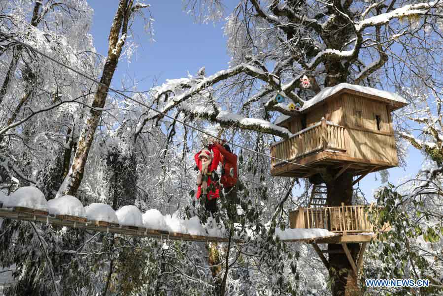 A student from Huchangbao Primary School heads to a tree house through a wire rope in Longcanggou National Forest Park in Yingjing County, southwest China's Sichuan Province, Jan. 13, 2021. Recent years Yingjing County has organized a series of educational activities in Longcanggou National Forest Park to boost local education in natural environment. (Xinhua/Jiang Hongjing)