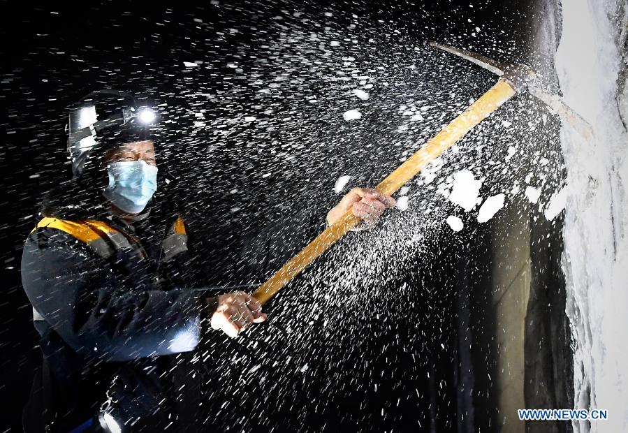 Guo Zhenzhong clears icicles off Guanyintang tunnel wall in Luoyang, central China's Henan Province, Jan. 12, 2021. Every year in winter, railway workers like Guo Zhenzhong are responsible for clearing icicles due to water seepage in railway tunnels to ensure safe operation of trains in Luoyang. "It is common to clear icicles four or five times a day. In extremely cold weather, it takes nine times at most. It takes me 26,000 steps to clear icicles in the 600-meter Guanyintang tunnel in a day, "Guo Zhenzhong said. (Xinhua/Li An)