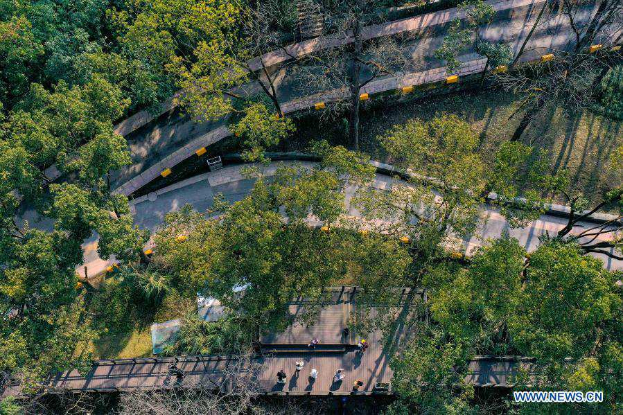 Aerial photo taken on Jan. 15, 2021 shows visitors enjoying their leisure at Ahahu national wetland park in Guiyang, capital of southwest China's Guizhou Province. Local authorities in Guiyang have built 660 parks since 2015, including forest park, wetland park, mountain park and so on, adding the total number of parks here to 1,025 by far. (Xinhua/Ou Dongqu)