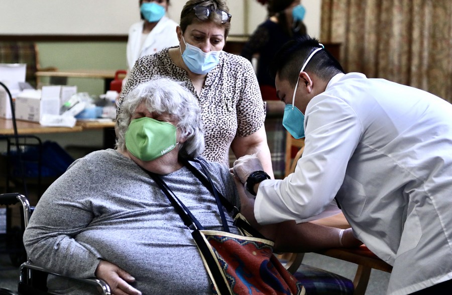A resident receives a dose of COVID-19 vaccine in Pasadena, Los Angeles County, California, the United States, Jan. 15, 2021. (Xinhua)