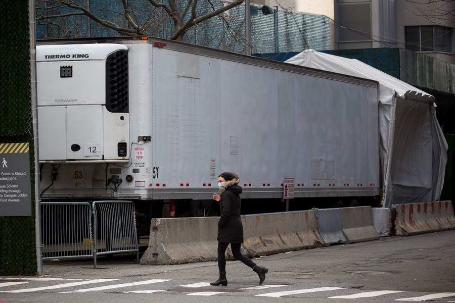 A woman walks past a refrigerated trailer serving as a temporary morgue in New York, the United States, on Jan. 18, 2021. (Photo by Michael Nagle/Xinhua)