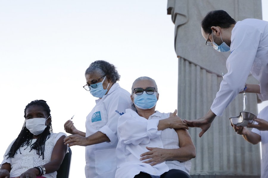 Dulcinea da Silva Lopes (R), a 59-year-old mediacal worker, receives a dose of China's COVID-19 vaccine in Rio de Janeiro, Brazil, Jan. 18, 2021. (Brazilian National News Agency/Handout via Xinhua)