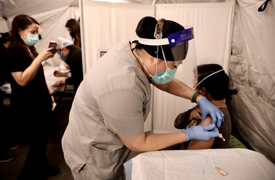 A frontline health care worker at Garfield Medical Center receives his first dose of Pfizer COVID-19 vaccine in a pop-up tent outside their main facility in Monterey Park, Los Angeles County, California, the United States, Dec. 18, 2020. (Xinhua)