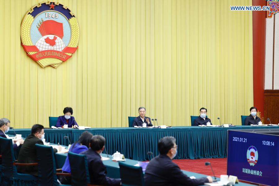 Wang Yang, a member of the Standing Committee of the Political Bureau of the Communist Party of China Central Committee and chairman of the Chinese People's Political Consultative Conference (CPPCC) National Committee, presides over a bi-weekly seminar held by the CPPCC National Committee in Beijing, capital of China, Jan. 21, 2021. (Xinhua/Liu Bin)
