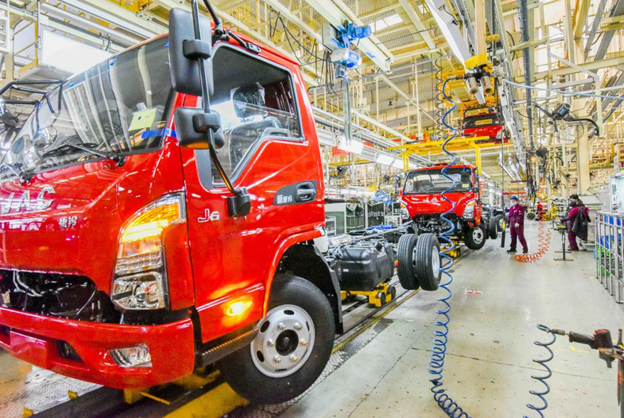 Trucks are being assembled on a production line of an automaker in Qingzhou, east China's Shandong province, Jan. 18, 2021. (Photo by Wang Jilin/People's Daily Online)