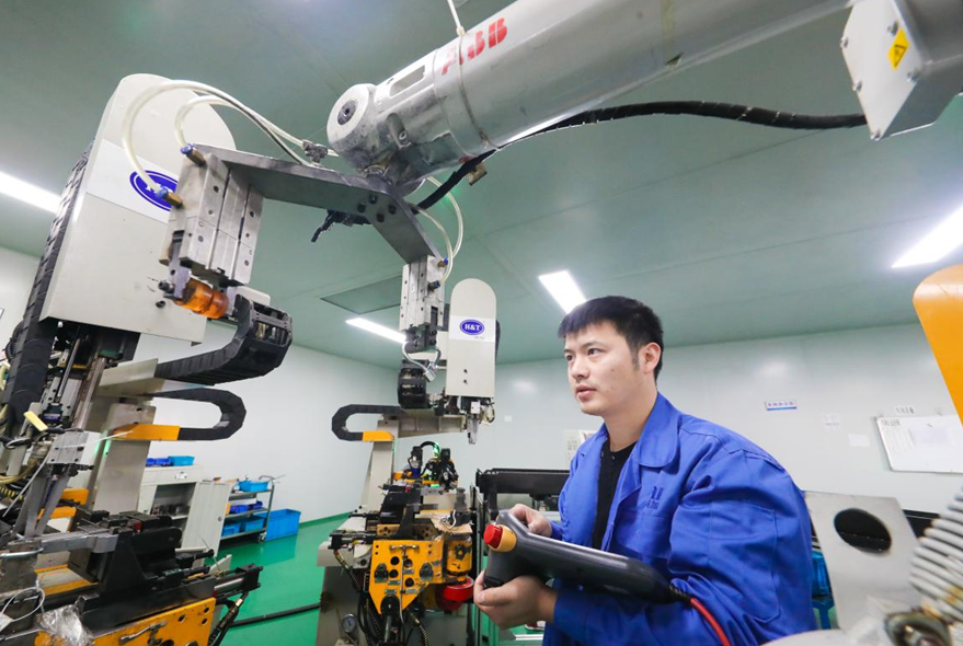 A worker manufactures products to be shipped overseas at an auto parts company in Huzhou, east China's Zhejiang province, Jan. 13, 2021. (Photo by Wang Zheng/People's Daily Online)