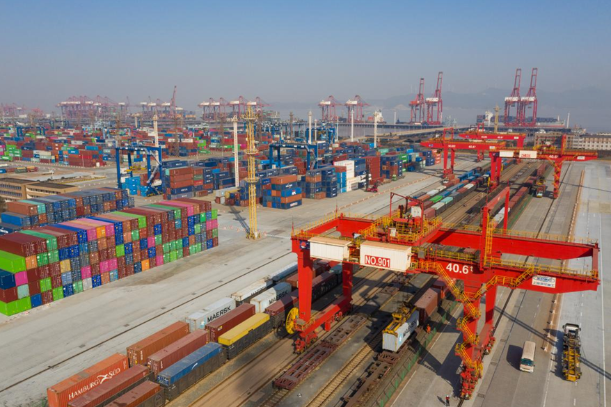 Cargos are being loaded on and unloaded from international freight trains at Beilun Port along the Ningbo-Zhoushan rail, Jan. 8, 2021. (Photo by Jiang Xiaodong/People's Daily Online)