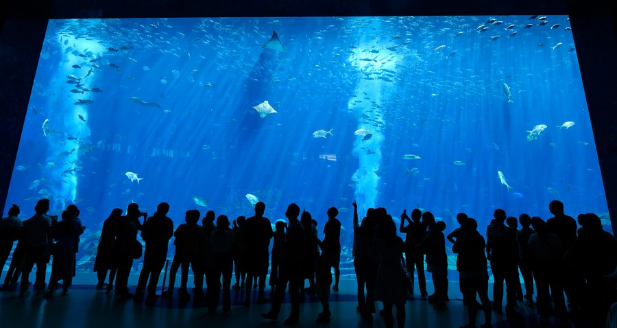 Tourists visit an aquarium at the Atlantis resort in Sanya, south China's Hainan Province, Aug. 6, 2020. (Xinhua/Yang Guanyu)