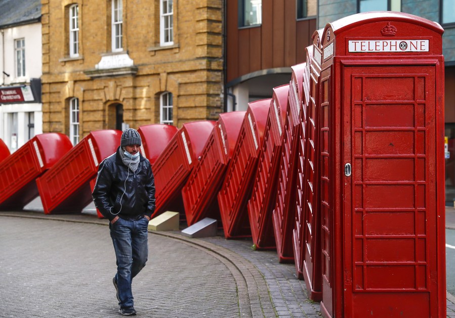 A man walks by a sculpture of red telephone boxes titled "Out of Order" in Kingston upon Thames, Britain, on Jan. 21, 2021. (Xinhua/Han Yan)