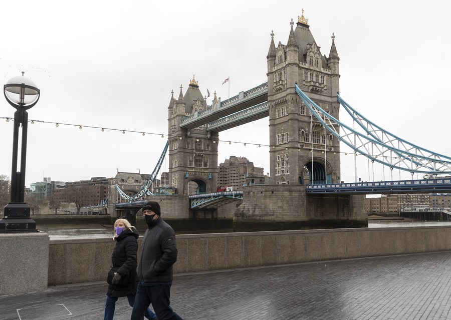 People wearing face masks walk by the River Thames backdropped by the Tower Bridge in London, Britain, on Jan. 5, 2021. (Xinhua/Han Yan)