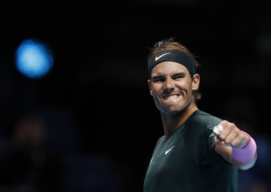 Rafael Nadal of Spain celebrates after winning the singles group match against Stefanos Tsitsipas of Greece at the ATP World Tour Finals 2020 in London, Britain, on Nov. 19, 2020. (Xinhua/Han Yan)