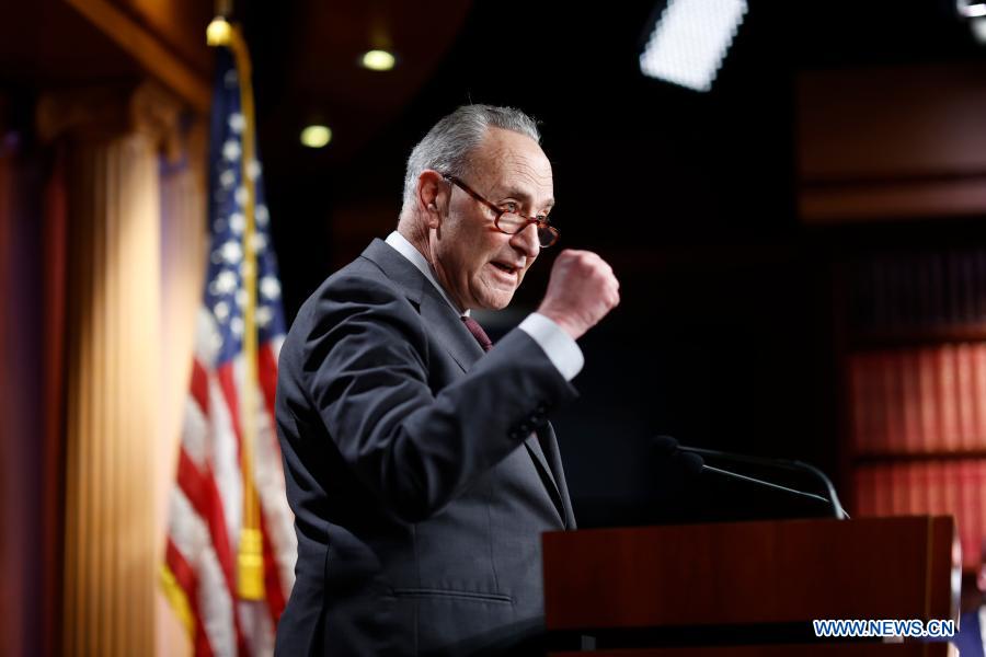 U.S. Senate Majority Leader Chuck Schumer speaks during a press conference on Capitol Hill in Washington D.C., the United States, Feb. 2, 2021. U.S. Senate Majority Leader Chuck Schumer and Senate Minority Leader Mitch McConnell have reached a power-sharing resolution for running a 50-50 upper chamber, allowing Democrats to take control of powerful Senate committees, local media reported on Tuesday. (Photo by Ting Shen/Xinhua)