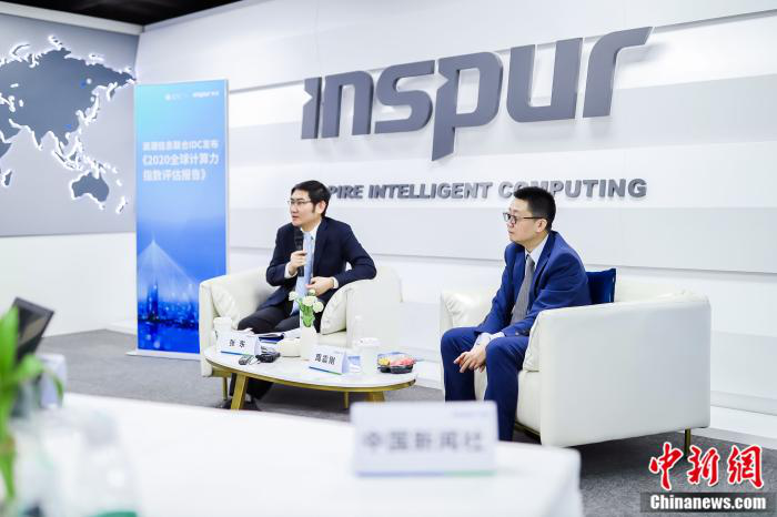Zhou Zhen'gang (right), assistant deputy general manager of IDC China, and Zhang Dong, deputy general of Inspur, launch the report in Beijing on Feb 4, 2021. [Photo/China News Service]