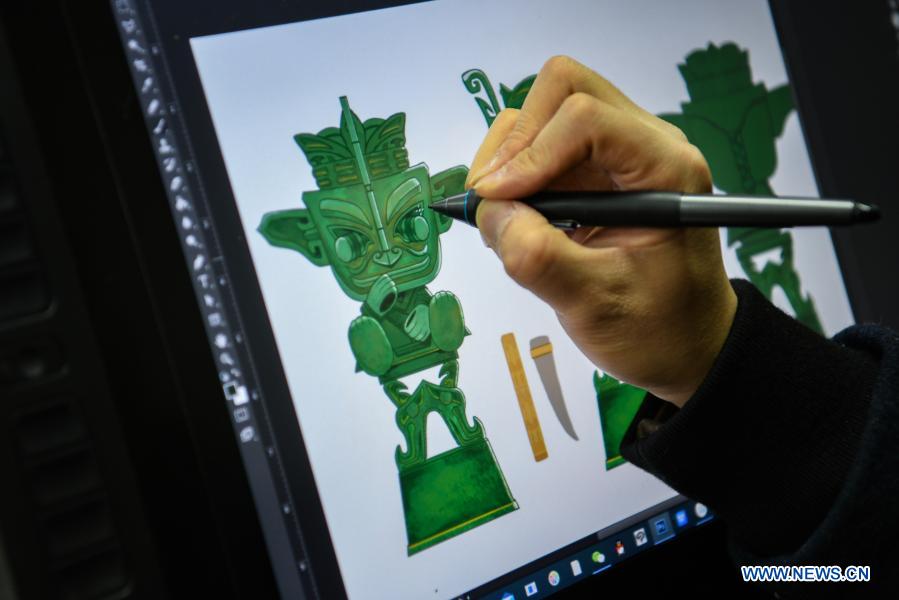 Zeng Zhou works on the design of a toy figure at a cultural industrial park in Chengdu, southwest China's Sichuan Province, Feb. 4, 2021. Zeng Zhou is a 31-year-old independent designer working on toy figure design. Inspired by a visiting experience at Sanxingdui Museum in Sichuan, Zeng decided to design model figures imitating bronze relics of the Sanxingdui Ruins, which are believed to be remnants of the Shu Kingdom dating back 2,600 years to 4,800 years, blending traditional Chinese culture with fashion toys. Zeng Zhou is now dedicated to optimizing his design and promoting mass production of his toy figures. "I hope more collections of cultural relics of our country could be displayed by means of trendy, stylish designs," Zeng Zhou said. (Xinhua/Wang Xi)