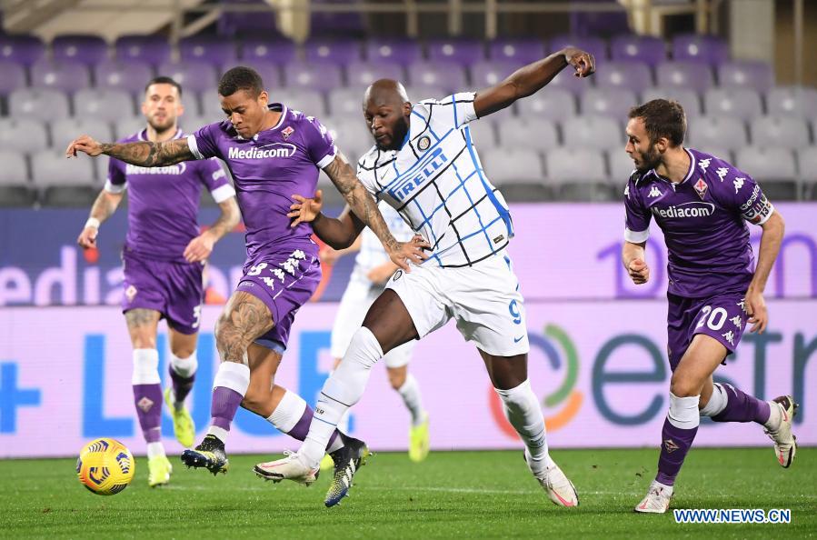 FC Inter's Romelu Lukaku (2nd R) vies with Fiorentina's Igor (2nd L) during a serie A football match between Fiorentina and FC Inter in Florence, Italy, Feb. 5, 2021. (Xinhua/Alberto Lingria)
