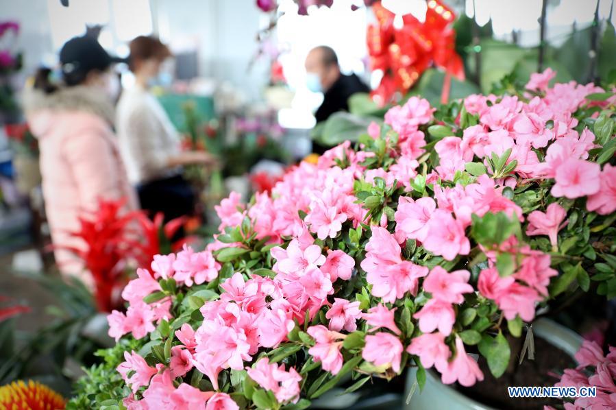 Customers select flowers at a flower market in Tiexi District of Anshan, northeast China's Liaoning Province, Feb. 5, 2021. Flowers become popular among local customers as the Spring Festival draws near. (Xinhua/Yao Jianfeng)