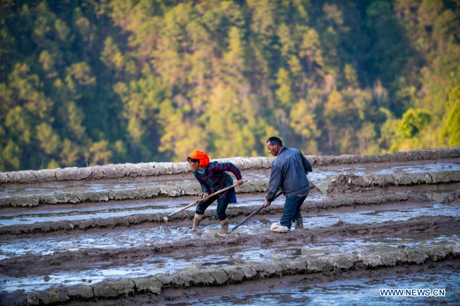 Two farmers work in Hani terraced fields in Sancun Township of Honghe County, southwest China's Yunnan Province., Feb. 4, 2021. (Xinhua/Chen Xinbo)