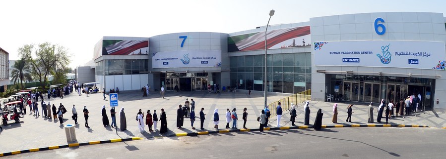 People wait to enter the vaccination center to receive the COVID-19 vaccine in Hawalli Governorate, Kuwait, Feb. 4, 2021. (Photo by Asad/Xinhua)