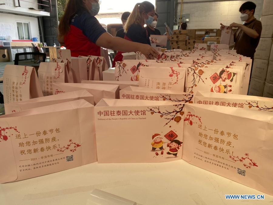 Staff members arrange Spring Festival kits to be distributed by the Chinese Embassy in Thailand among overseas Chinese in Bangkok, Thailand, Jan. 29, 2021. Chinese embassies and other diplomatic representations all over the world have been distributing Spring Festival kits containing items for epidemic prevention and other daily supplies to local Chinese communities as the Chinese New Year of the Ox draws near. (Xinhua)