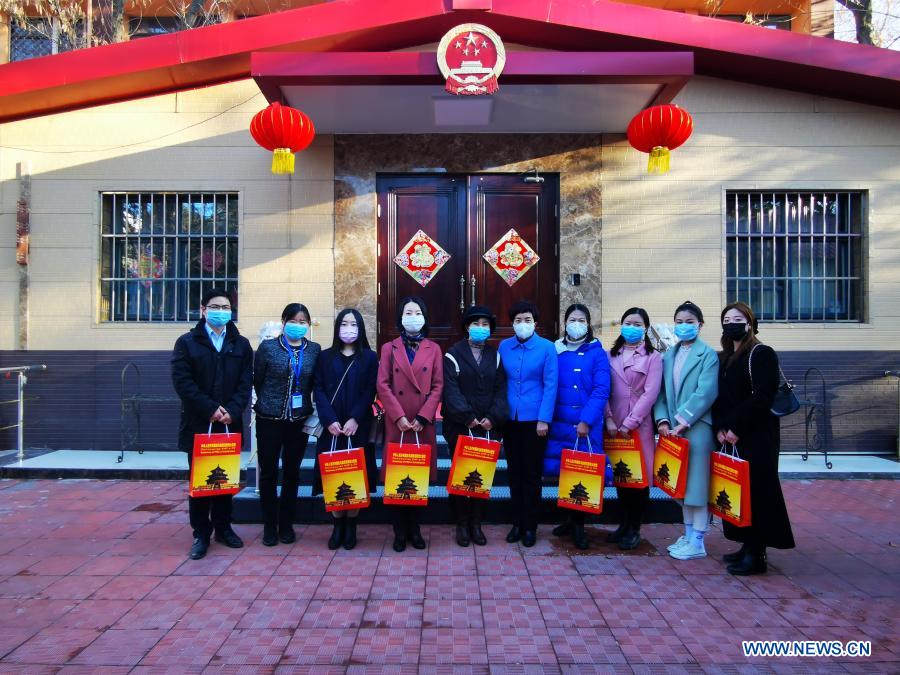 Chinese Ambassador to Uzbekistan Jiang Yan (5th R) poses for group photos after distributing Spring Festival kits to representatives of teachers of Chinese language and Chinese students at the Chinese Embassy in Tashkent, Uzbekistan, Jan. 26, 2021. Chinese embassies and other diplomatic representations all over the world have been distributing Spring Festival kits containing items for epidemic prevention and other daily supplies to local Chinese communities as the Chinese New Year of the Ox draws near. (Chinese Embassy in Uzbekistan/Handout via Xinhua)