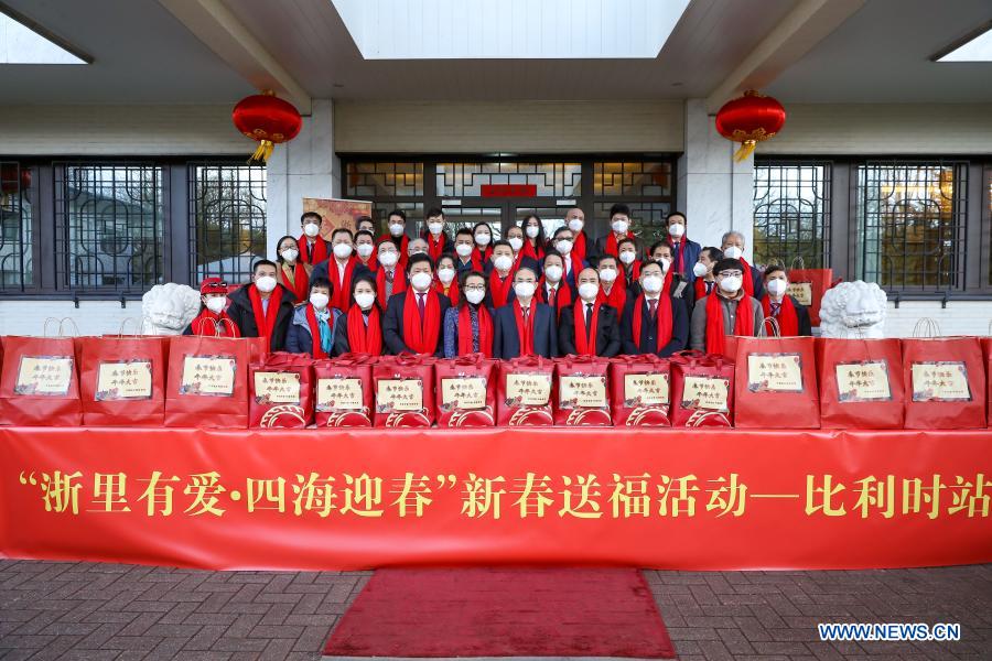 Photo taken on Feb. 3, 2021 shows people at an event distributing Spring Festival kits in Brussels, Belgium. Chinese embassies and other diplomatic representations all over the world have been distributing Spring Festival kits containing items for epidemic prevention and other daily supplies to local Chinese communities as the Chinese New Year of the Ox draws near. (Xinhua/Zhang Cheng)