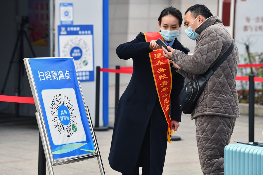 A staff member helps a passenger scan the health tracking QR code before entering Kaili South Railway Station in southwest China's Guizhou Province, Jan. 28, 2021. (Xinhua/Yang Wenbin)