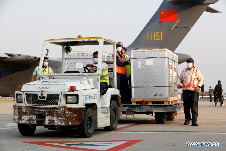 Workers transfer the China-donated Sinopharm COVID-19 vaccines at the Phnom Penh International Airport in Phnom Penh, Cambodia, Feb. 7, 2021. A chartered flight carrying the first batch of the China-donated Sinopharm COVID-19 vaccines arrived in Cambodia on Sunday, welcomed by Prime Minister Samdech Techo Hun Sen at the Phnom Penh International Airport. (Photo by Sovannara/Xinhua)