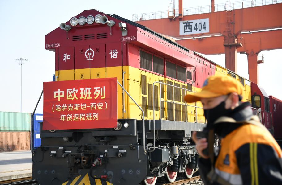 A returning China-Europe freight train from Kazakhstan arrives at the Xinzhu Station of China Railway Xi'an Bureau Group Co., Ltd. in Xi'an City of northwest China's Shaanxi Province, Feb. 3, 2021. (Xinhua/Li Yibo)
