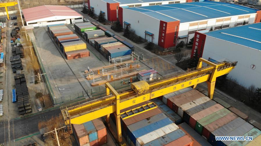 Aerial photo taken on Feb. 8, 2021 shows cargoes of "Qilu" freight train in east China's Shandong Province. In January 2021, 118 trips of "Qilu" freight train were made, up 45.7 percent year on year. The value of exports and imports via the train services was about 1.3 billion yuan (201.5 million U.S. dollars), up 205.2 percent year on year, according to the service operator Shandong High-speed Group. (Xinhua/Wang Kai)