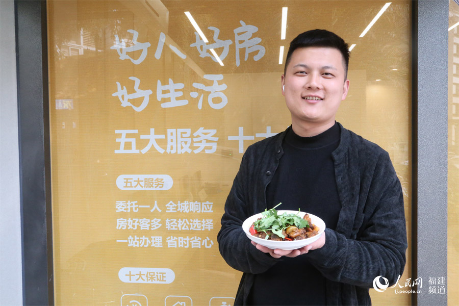 Zhang Zhaolong from Anshun in southwest China’s Guizhou province showcases his hometown dish – spicy chicken with pepper – in Fuzhou, southeast China’s Fujian province. It will be his first time in the past 10 years to spend the Spring Festival holiday in Fuzhou instead of in his hometown. (Photo/Ye Qingqing)