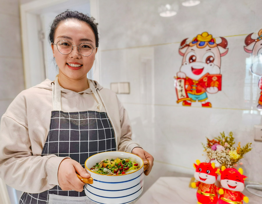 Wu Xizhuo, a primary school teacher in Putian, southeast China’s Fujian province, displays a stew originating from her hometown in Shijiazhuang, north China’s Hebei province. It will be her first time in the past many years to spend the Spring Festival holiday in Putian instead of at her hometown. (Photo/Hu Aang)