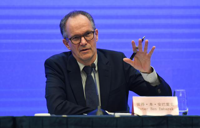 Peter Ben Embarek, a member of the WHO-China joint study team, answers questions at the WHO-China joint study press conference in Wuhan, central China’s Hubei Province, Feb. 9, 2021. (Xinhua/Cheng Min)