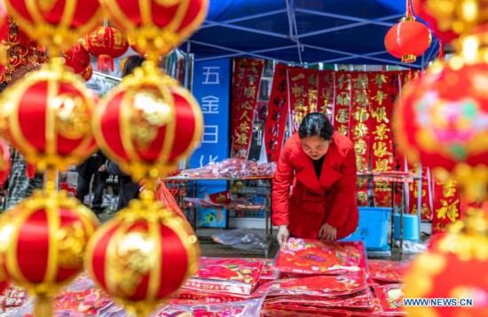 A customer purchases decorations for the upcoming Chinese Lunar New Year in Taohong Town of Longhui County in Shaoyang City, central China's Hunan Province, Feb. 10, 2021. (Photo by Fan Hui/Xinhua)