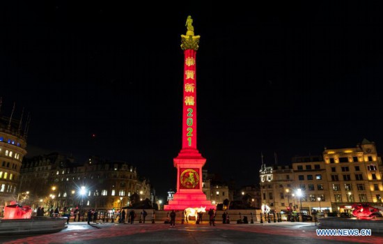 Photo taken on Feb. 10, 2021 shows the Nelson's Column and fountains illuminated in red to celebrate the forthcoming Chinese Lunar New Year, the Year of the Ox, at Trafalgar Square in London, Britain. (Xinhua/Han Yan)