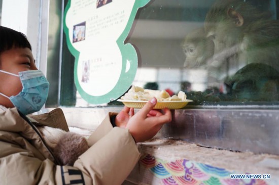 A kid shows the "dumplings" he made to animals at the Qinghai-Tibet Plateau Wild Zoo in Xining, northwest China's Qinghai Province, Feb. 10. 2021. The Qinghai-Tibet Plateau Wild Zoo on Wednesday organized an activity with the Qinghai Environmental Education Association to prepare "special dumplings" made of nuts, fruits and vegetables for the zoo animals, so that children interacted with small animals to celebrate the upcoming Chinese Lunar New Year. (Xinhua/Lan Xiang)