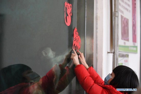 A kid puts up a paper-cutting on a window at the Qinghai-Tibet Plateau Wild Zoo in Xining, northwest China's Qinghai Province, Feb. 10. 2021. The Qinghai-Tibet Plateau Wild Zoo on Wednesday organized an activity with the Qinghai Environmental Education Association to prepare "special dumplings" made of nuts, fruits and vegetables for the zoo animals, so that children interacted with small animals to celebrate the upcoming Chinese Lunar New Year. (Xinhua/Zhang Manyi)