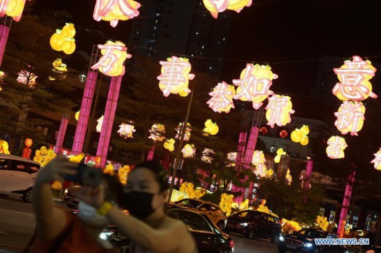 People take photos of the Lunar New Year lantern decorations in Singapore's Chinatown area on Feb. 10, 2021. (Photo by Then Chih Wey/Xinhua)
