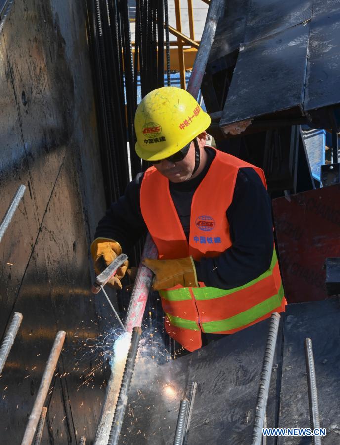 A laborer works at the construction site of Meizhou Bay cross-sea bridge of the Fuzhou-Xiamen high-speed railway in southeast China's Fujian Province, Feb. 15, 2021. Some 500 laborers still work at the construction site of the bridge during the Chinese Lunar New Year. The 14.7-km-long bridge is part of the province's Fuzhou-Xiamen high-speed railway, the first cross-sea high-speed railway in China, which is expected to be put into operation in 2022. (Xinhua/Song Weiwei)