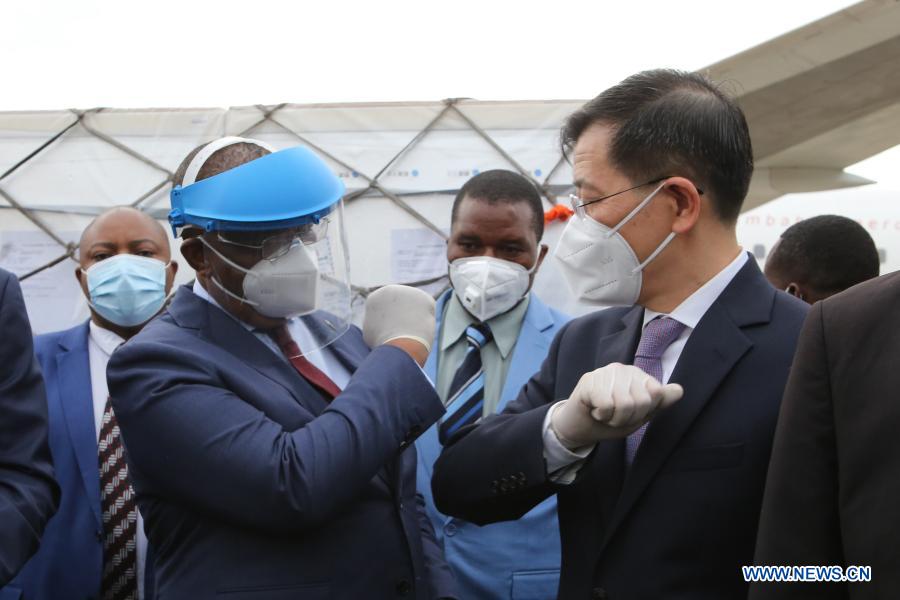 Zimbabwean Vice President Constantino Chiwenga (L, front) and Chinese ambassador to Zimbabwe Guo Shaochun (R, front) attend the handover ceremony at Robert Mugabe International Airport in Harare, Zimbabwe, Feb. 15, 2021. A batch of COVID-19 vaccines donated by China arrived in Robert Mugabe International Airport in Zimbabwe's capital here on early Monday morning. The 200,000 doses of Sinopharm vaccines are the first batch that Zimbabwe has received as it steps up efforts to curb the spread of the COVID-19 pandemic. (Photo by Chen Yaqin/Xinhua)