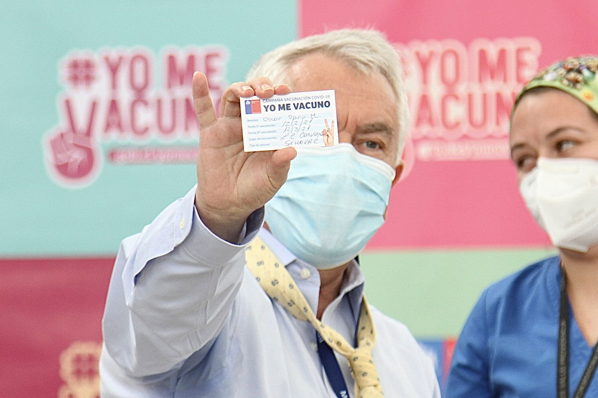 Chilean Health Minister Enrique Paris shows an ID reading 'I get vaccinated' after receiving a dose of Sinovac's CoronaVac coronavirus disease (COVID-19) vaccine at a health care center in Santiago, Chile, Feb 12, 2021. [Photo/Xinhua]