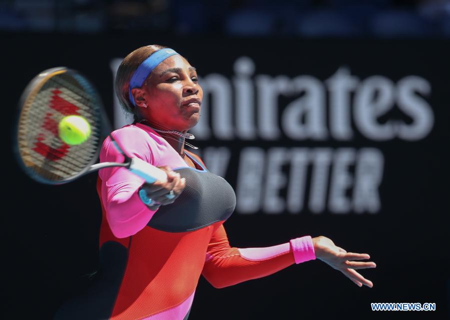 Serena Williams of the United States hits a return during the women's singles semifinal between Osaka Naomi of Japan and Serena Williams of the United States at Australian Open in Melbourne Park in Melbourne, Australia, Feb. 18, 2021. (Photo by Hu Jingchen/Xinhua)