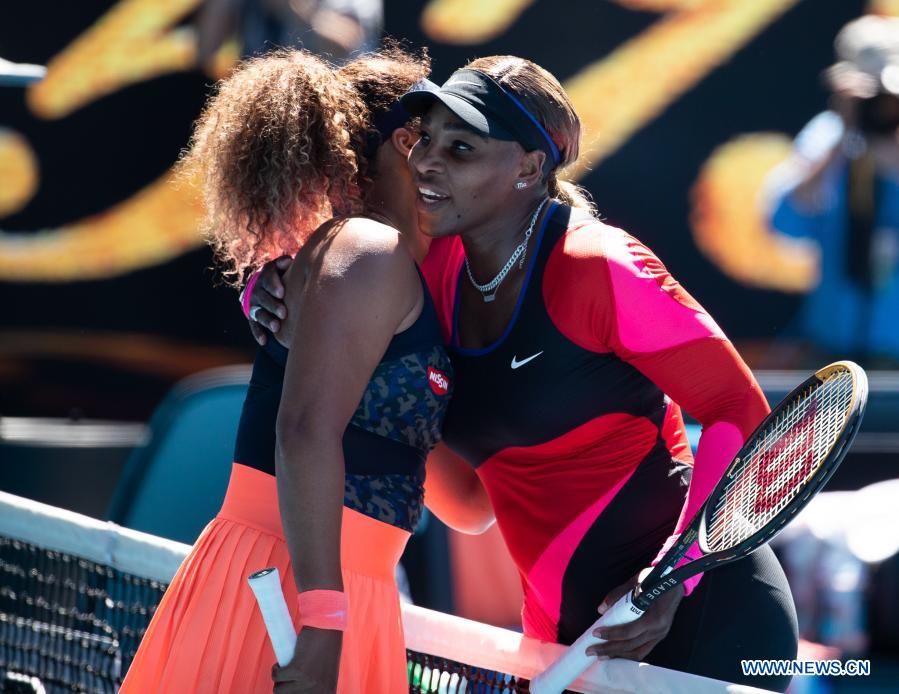 Osaka Naomi (L) of Japan and Serena Williams of the United States greet each other after their women's singles semifinal at Australian Open in Melbourne Park in Melbourne, Australia, Feb. 18, 2021. (Photo by Hu Jingchen/Xinhua)
