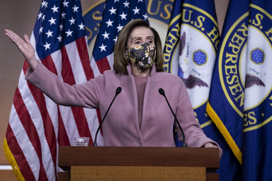 U.S. House Speaker Nancy Pelosi speaks during a press conference on Capitol Hill in Washington, D.C., the United States, Jan. 21, 2021. (Photo by Ting Shen/Xinhua)