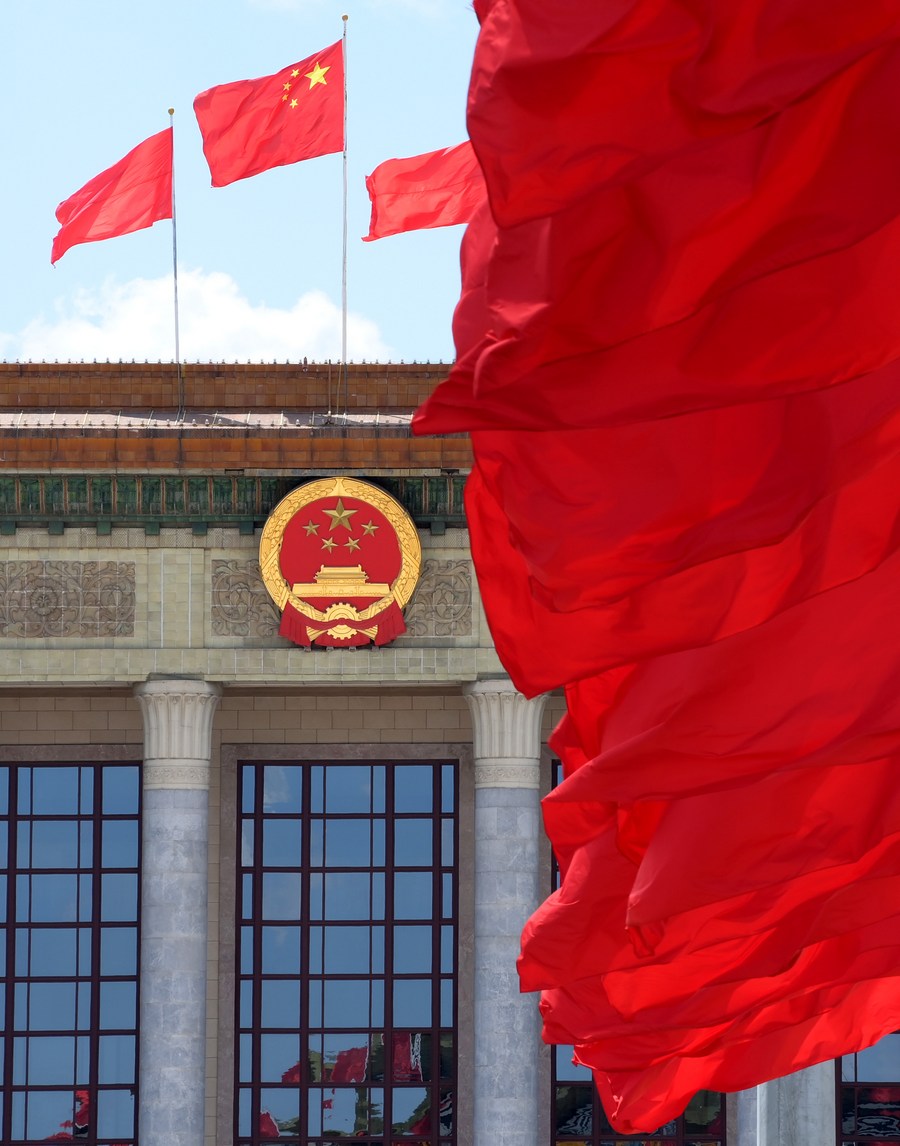 Photo taken on May 27, 2020 shows flags on the Tian'anmen Square and atop the Great Hall of the People in Beijing, capital of China. (Xinhua/Li He)
